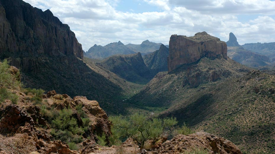 From the south shore of the Salt River's busy Canyon Lake, Boulder Canyon Trail leads into the western Superstition Wilderness and the seclusion of the LaBarge and Boulder Canyons. Up through the hills south of the lake, the initial climb is rewarded with a unique view of Weaver?s Needle, followed by a descent into LaBarge Canyon and a dramatic approach to the prominent northern end of Battleship Mountain. Over a small hill into Boulder Canyon, the trail passes the junction with Second Water Trail, one of several potential loop options in the area.